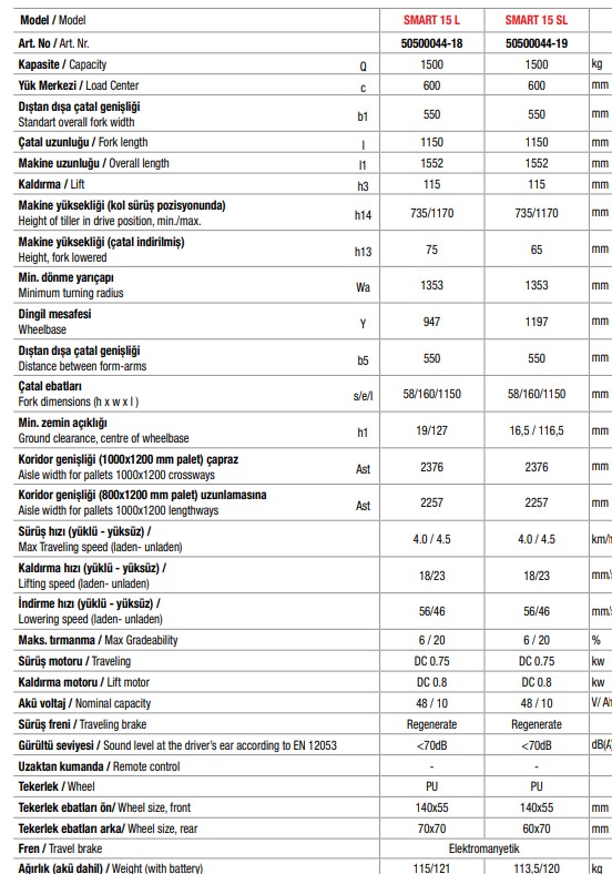 Smart 15 L modeli, 75 mm düşük şase yapısıyla alçak palet girişlerini kolaylaştırır.