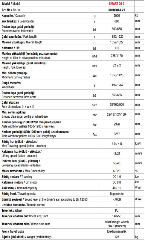 2000 kg taşıma kapasitesi ile ağır yüklerde yüksek dayanıklılık sunar. Lityum-ion akü sistemi paslanma riski olmadan uzun süreli performans sağlar.