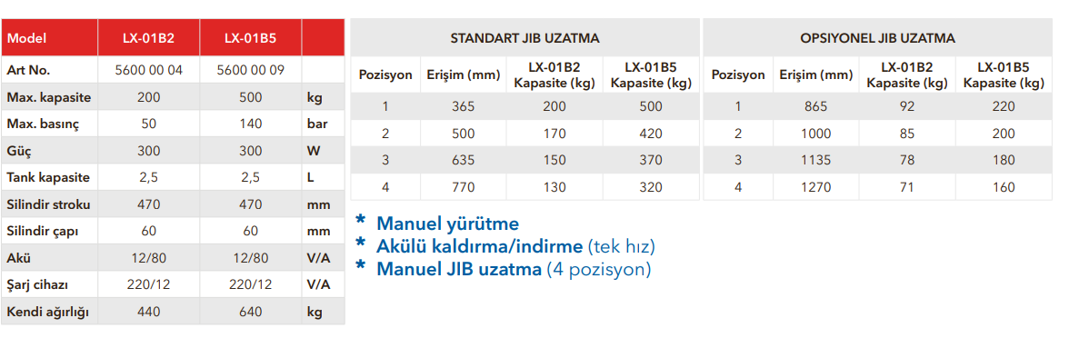200 kg'lık denge ağırlıklı döner vinç modeli LX-01B2, kaldırma indirme işlemi kablolu kumanda vasıtasıyla12V 80Ah akü yardımı ile gerçekleştirir, kumanda üzerine acil durdurma butonu yer alır. Vinç üzerine yüksek dahili yüksek frekans şarj cihazı ve şarj seviye göstergesi bulunur.