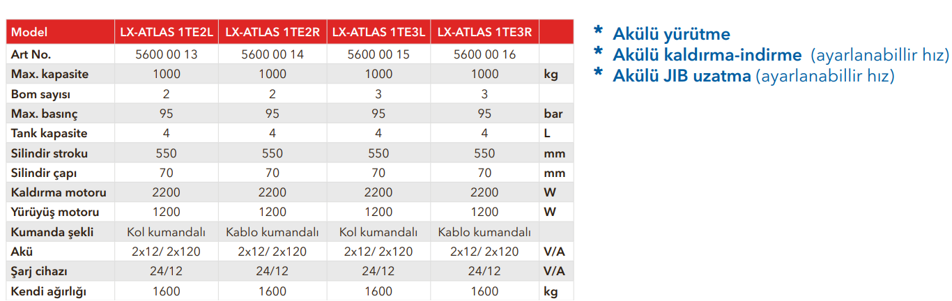 LX- ATLAS 1TE2L ve LX- ATLAS 1TE2R tüm sektörlerde kullanılabilen sessiz, çevreci ve sıfır emisyonlu tam elektrikli vinçlerdir. Uluslararası sağlık ve süvenlik standartlarına uygundur (acil durum düğmeleri, uyarı cihazları, tahliye ve çek valfler). Her iki model de, operatörün yükü sadece izin verilen limitler dahilinde kullanmasını sağlayan limitleyiciler bulunur, bu limitleyiciler bomun farklı konumlarında da bulunup aşırı yükse bomun ilerlemesini engeller.
