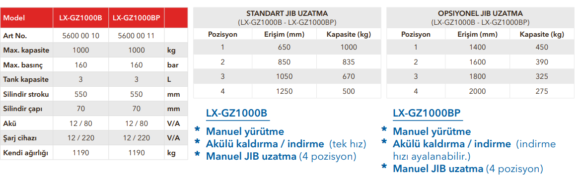 LX-GZ1000B model sabit kollu denge ağırlıklı vinç, tek hızlı kaldırma indirme işlemi kablolu kumanda vasıtasıyla 12V 80Ah akü yardımı ile gerçekleştirir, kumanda üzerine acil durdurma butonu yer alır. Vinç üzerine yüksek dahili yüksek frekans şarj cihazı ve şarj seviye göstergesi bulunur.