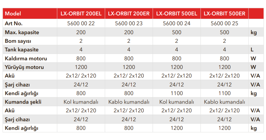 LX-ORBIT 500 serisi akülü yürütmeli döner kollu denge ağırlıklı vinç modeli 500 kg kaldırma kapasitesine, 2m erişime ve çift bomlu yapıya sahiptir. 800 mm genişlik ve 1200 mm uzunluk ile kategorilerinde en az yer kaplayan motorlu vinç modelidir. Ağırlık döndürüldüğünde dahi 800 mm'lik vinç genişliğini aşmaz. Maksimum kaldırma yüksekliği 3700 mm dir.