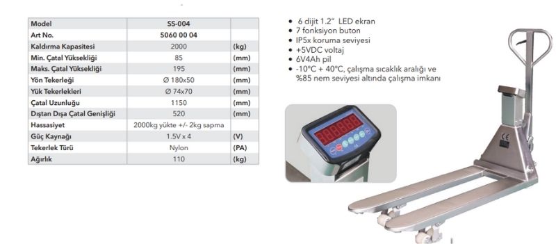 Paslanmaz terazili transpalet, aynı anda taşıma ve tartım işlemi için geliştirilmiştir.