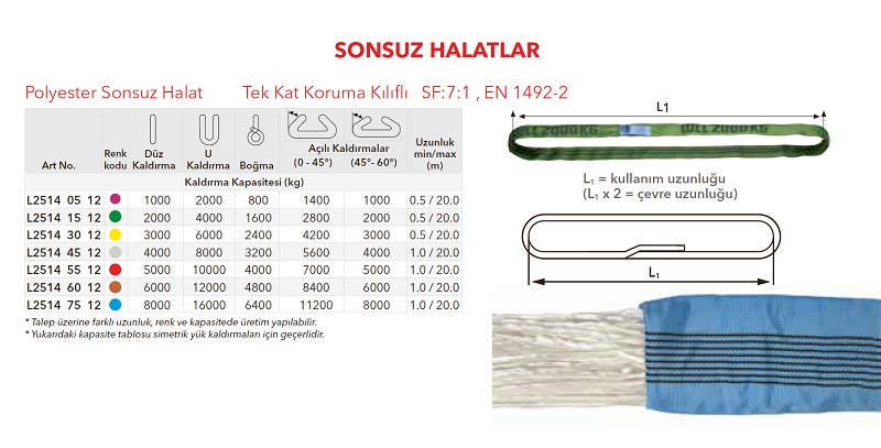 Bu model, 7:1 güvenlik katsayısı (SF: Safety Factor) ile tasarlanmış olup; endüstriyel kullanımda güvenli, hafif ve etkili bir çözüm sunar. 1 tondan 8 tona kadar geniş kapasite aralığına sahiptir. Ayrıca, 0.5 metreden 20 metreye kadar değişen uzunluk seçenekleriyle her türlü uygulamaya uyum sağlar.