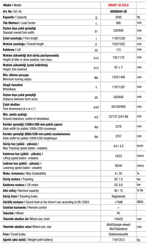Smart 20 Cold, -30°C’ye kadar soğuk hava depolarında çalışmak üzere özel olarak tasarlanmıştır.